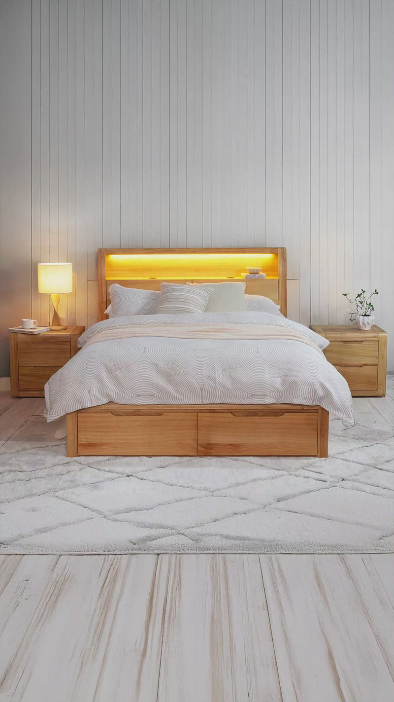 At the heart of the suite is the curved bookshelf bedhead, thoughtfully designed with integrated LED lighting and 2 wireless chargers, making it as functional as it is elegant. The gas-lift base with 2 built-in drawers adds hidden storage for blankets, shoes, or anything you want out of sight but close at hand.